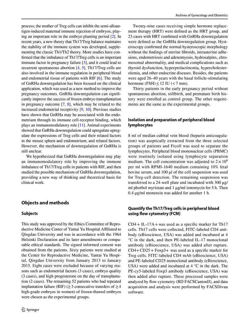 目的:探討促性腺激素釋放激素激動劑(GnRHa)降調對原因不明的反復移植失敗(RIF)患者外周血Th17 / Treg(調節性T細胞)細胞的影響及其可能機制。