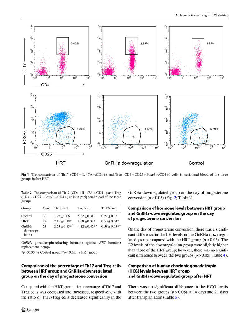 結果HRT前,HRT組與對照組相比,CD4+淋巴細胞中的Th17Treg細胞數量分別增加和減少,Th17 / Treg細胞比值升高(p<0.05)。在孕酮轉化當天,與HRT組相比,GnRHa降調組的Th17Treg細胞百分比分別降低和升高,Th17 / Treg細胞比值顯著降低(p<0.05)。GnRHa降調組的雌激素(E2)水平略高于HRT組,兩組間差異無統計學意義(p> 0.05)。此外,HRT組和GnRHa降調組在移植后第14天和第21天的絨毛膜促性腺激素水平沒有顯著差異(p>0.05)。