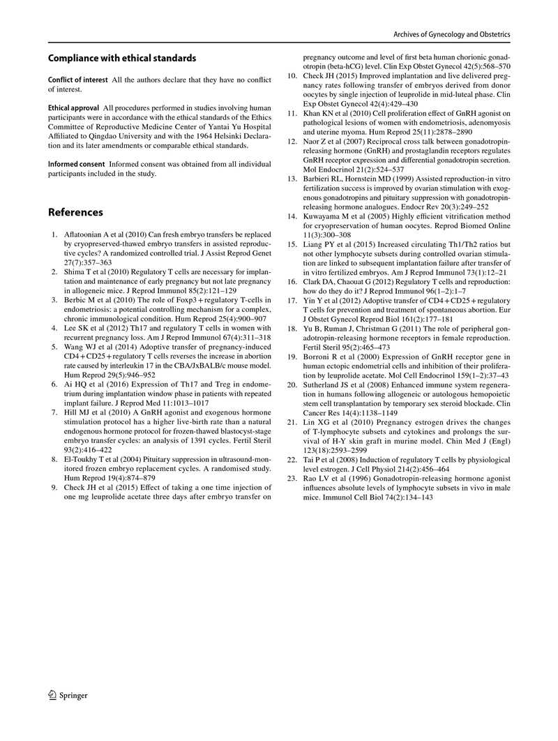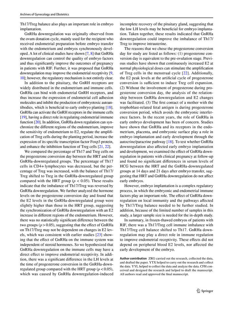 結論在不明原因的RIF患者中,Th17Treg細胞數量分別增加和減少,Th17 / Treg細胞比值失衡。GnRHa降調可能通過阻斷Th17/Treg細胞比值失衡發揮免疫調節作用從而提高子宮內膜容受性。這些作用不依賴于外周血中的E2水平,也不影響早期胚胎發育。
