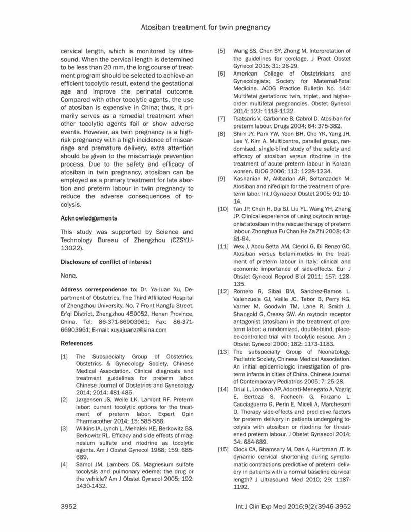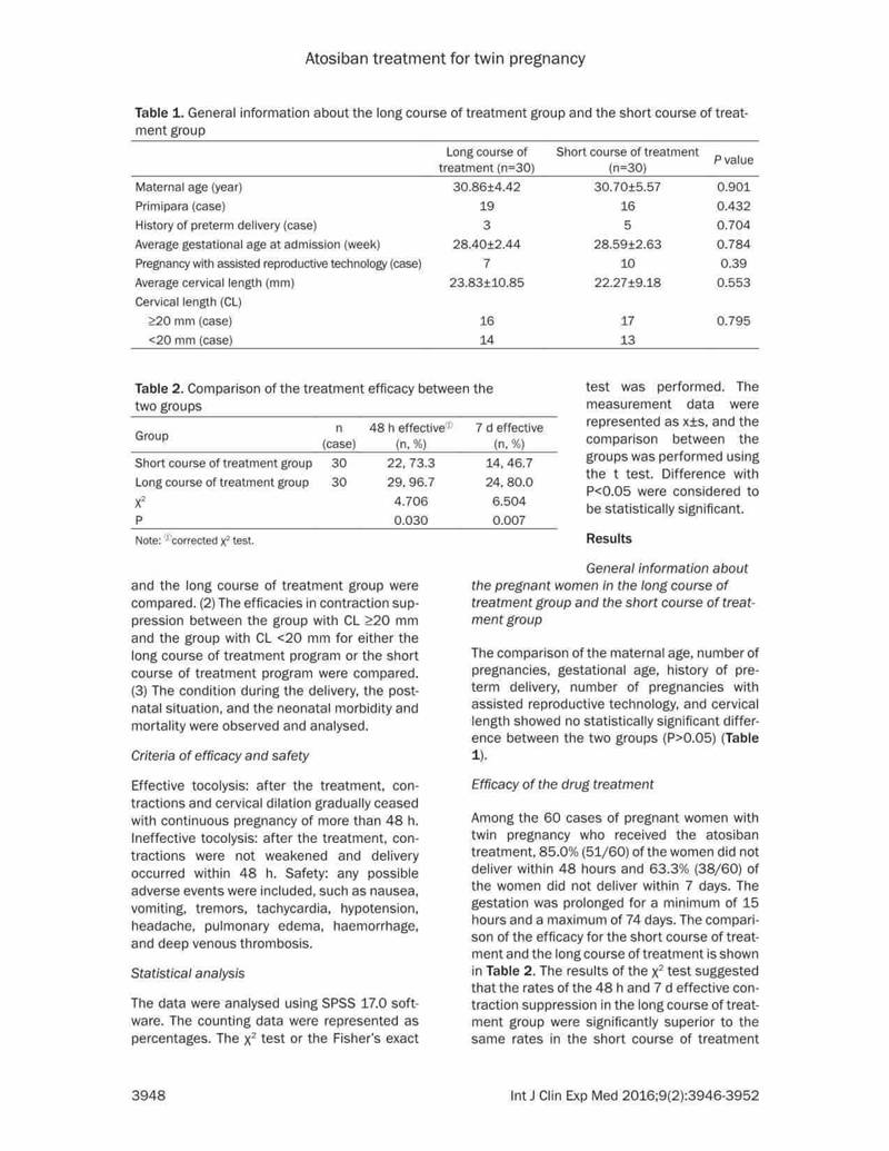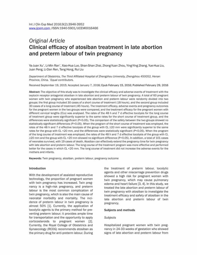 結(jié)論:阿托西班可有效延長(zhǎng)晚期流產(chǎn)以及早產(chǎn)的雙胎妊娠的妊娠時(shí)間。對(duì)于宮頸長(zhǎng)度<20mm的病例,長(zhǎng)療程治療更有效,效果更好。長(zhǎng)期治療不會(huì)增加母嬰的不良反應(yīng)。