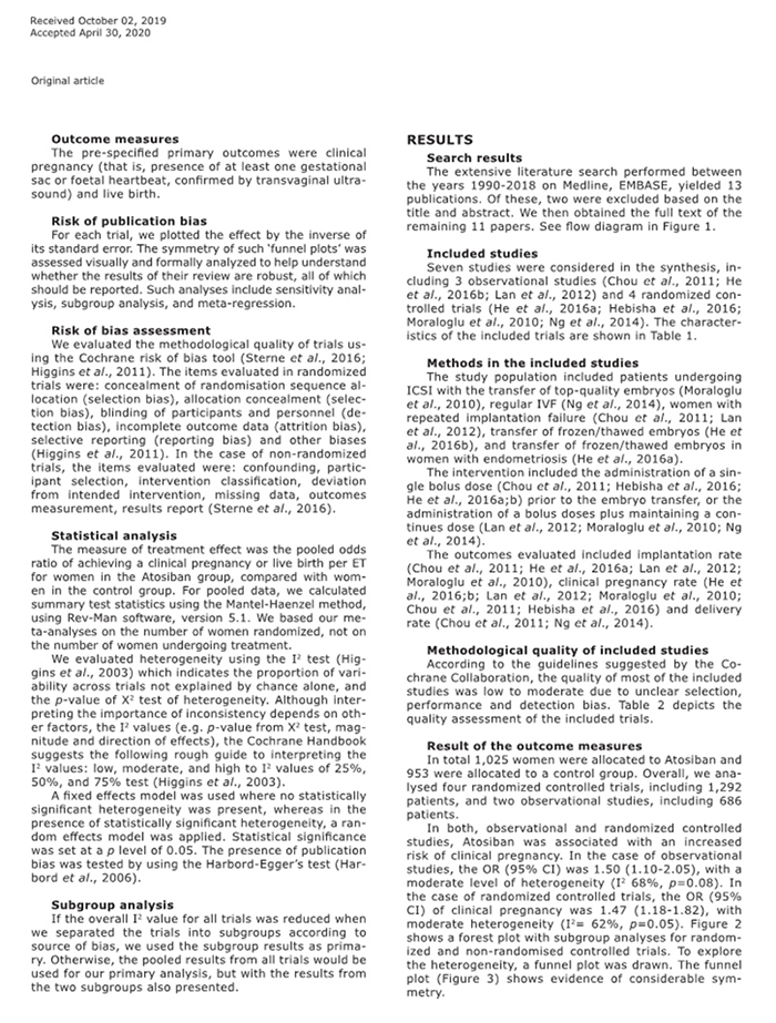 方法:數據來源:使用MEDLINE和EMBASE(1990-2019)數據庫對英文文章進行系統回顧,檢索詞:包括阿托西班、胚胎移植。研究選擇:我們納入將阿托西班與對照組進行胚胎移植結果比較的研究。數據提取:由兩位作者使用預定義的數據字段(包括研究質量指標)獨立提取論文。