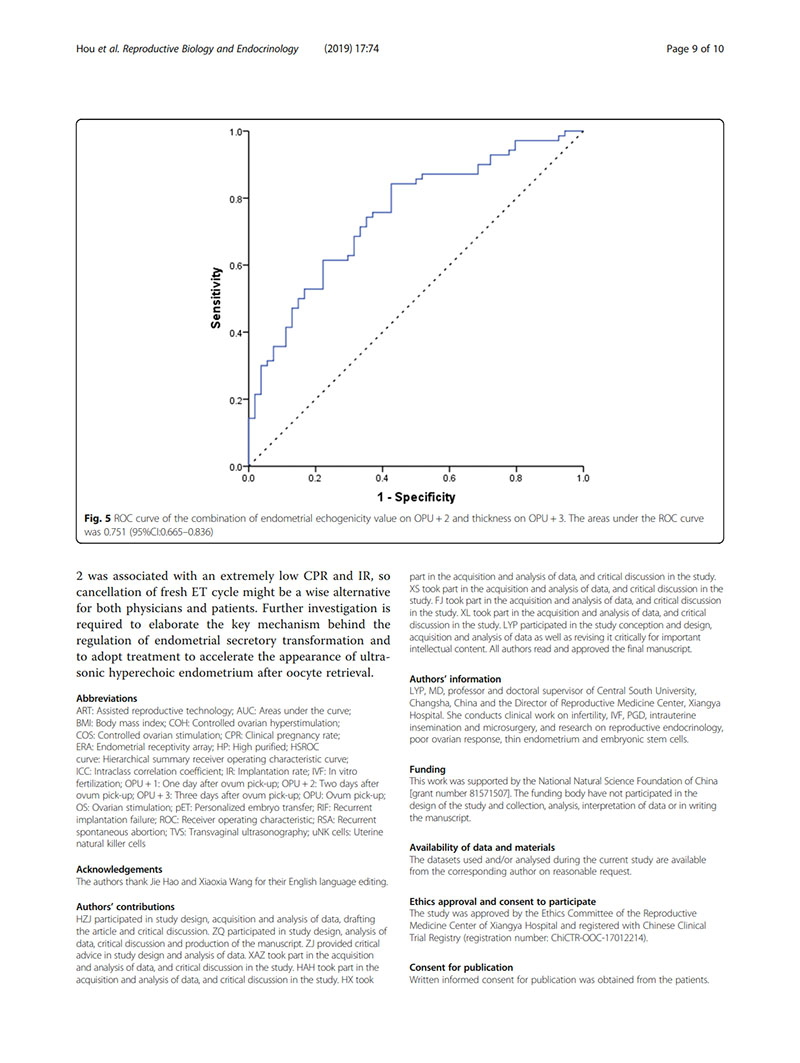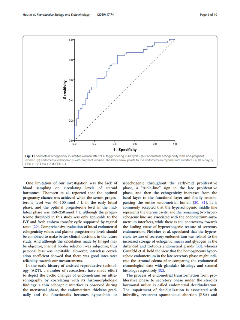 結論:建議用取卵后第2天(OPU+2)的子宮內膜回聲值評價子宮內膜容受性。當OPU+2的回聲值<60%時,臨床醫生似乎適合提供“全冷凍”IVF周期,并在隨后的凍融胚胎周期中進行移植。